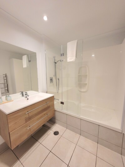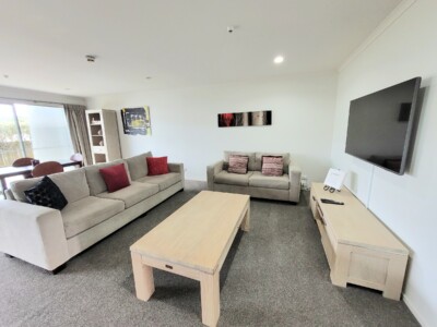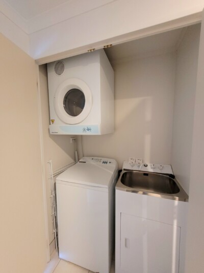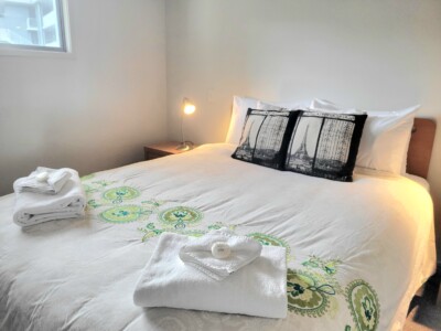 The bedrooms include a queen bed in the master + a queen and single in the second bedroom.